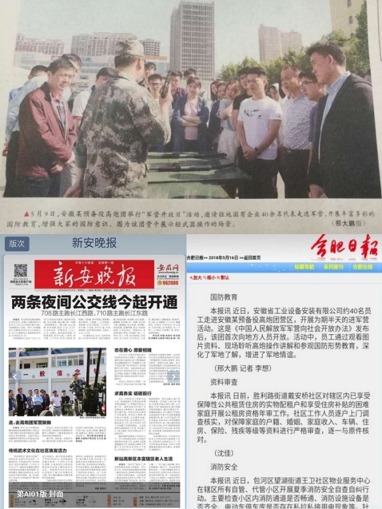 自5月9日安徽安裝公司組織開展赴安徽預(yù)備役師高炮團營區(qū)開展“走進軍營·感受軍魂”愛國主義教育實踐活動以來,合肥日報、新安晚報、人民陸軍報等多家媒體對此活動進行了報道。