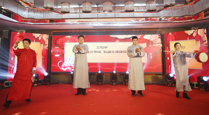 整場聯(lián)歡會由歌伴舞、朗誦、合唱、小品、樂器演奏、三句半、黃梅戲、音詩畫等16個節(jié)目組成,均為職工自編自導(dǎo)自演。在歌伴舞《今天是你的生日中》中,聯(lián)歡會正式拉開序幕?!妒“操潯芬愿木幇纥S梅戲劇的形式為公司送上美好的祝愿;配樂詩朗誦《春風(fēng)浩蕩啟新程,揚帆起航再出發(fā)》展現(xiàn)了安徽安裝人團結(jié)奮進(jìn),一往無前的精神風(fēng)貌;三句半《拼搏奮進(jìn)三號線,軌道交通捷報傳》以幽默的方式講述了軌道交通3號線合肥大劇院站項目部上的故事;音詩畫《奮斗是青春最亮麗的底色》講述了新疆烏蘇管廊、中水回用項目榮獲“安徽省工人先鋒號”背后的故事,向全體奮戰(zhàn)在項目施工一線的安徽安裝人致敬...歡快的旋律,優(yōu)美的舞姿,幽默的小品,豪邁的朗誦將現(xiàn)場的氣氛推向高潮,贏得了現(xiàn)場觀眾的歡呼喝彩與陣陣掌聲。