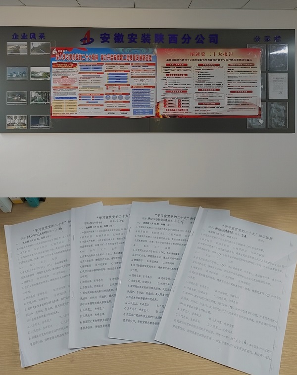 為抓好抓實黨的二十大精神的學習宣傳貫徹工作,近期,陜西分公司黨支部以“三會一課”、職工大會的形式組織開展黨員干部職工學習黨的二十大精神學習研討會;分公司開展“學習宣貫黨的二十大”知識答題活動,以考促學,以學促知,以知促用,充分檢驗學習效果;通過制作黨的二十大精神宣傳圖,開展立體式廣泛宣傳,推動大會精神深入職工群眾;通過開展一系列特色學習教育與宣傳活動,切實把黨的二十大精神帶到職工群眾身邊,為提高黨員干部職工對黨的二十大精神的全面掌握與學習起到促進作用,使黨的二十大精神成為分公司各項工作發展的思想與行動綱領。
