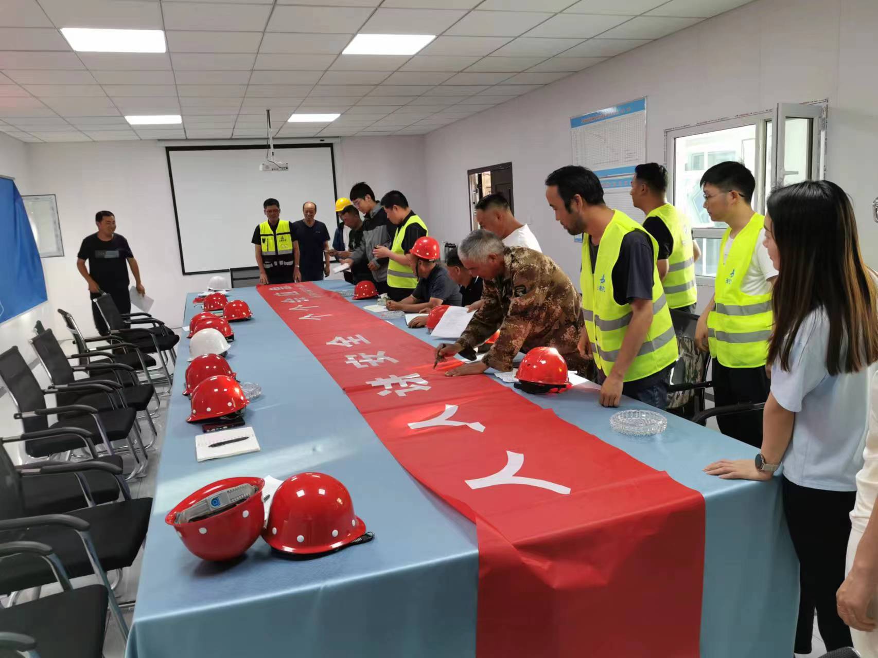 啟動儀式上,項目部安全員向大家宣讀此次安全月活動的活動方案,播放安全教育、警示類視頻,并著重講解施工現(xiàn)場及生活區(qū)一些常見而易忽視的安全隱患及防范措施,提升管理人員在面對風(fēng)險時的安全意識,并指出確保安全是各類生產(chǎn)活動的首要任務(wù),全員要樹立安全第一、生命至上的理念。分公司所屬項目部管理人員要嚴(yán)格落實(shí)安全生產(chǎn)責(zé)任制,樹牢安全紅線意識,通過宣傳教育、實(shí)戰(zhàn)演練、隱患排查等方式,讓分公司全體員工和所屬項目所有參建人員更積極主動參與到各項安全生產(chǎn)活動中來,清楚各自在安全體系管理中的責(zé)任及意義,努力營造一個“人人要安全、人人管安全”的良好安全管理氛圍,提升分公司安全管理水平。在儀式的最后,所有人員在安全員的帶領(lǐng)下莊嚴(yán)宣誓,并在印有“人人講安全,個個會應(yīng)急”的橫幅上進(jìn)行安全承諾簽名。