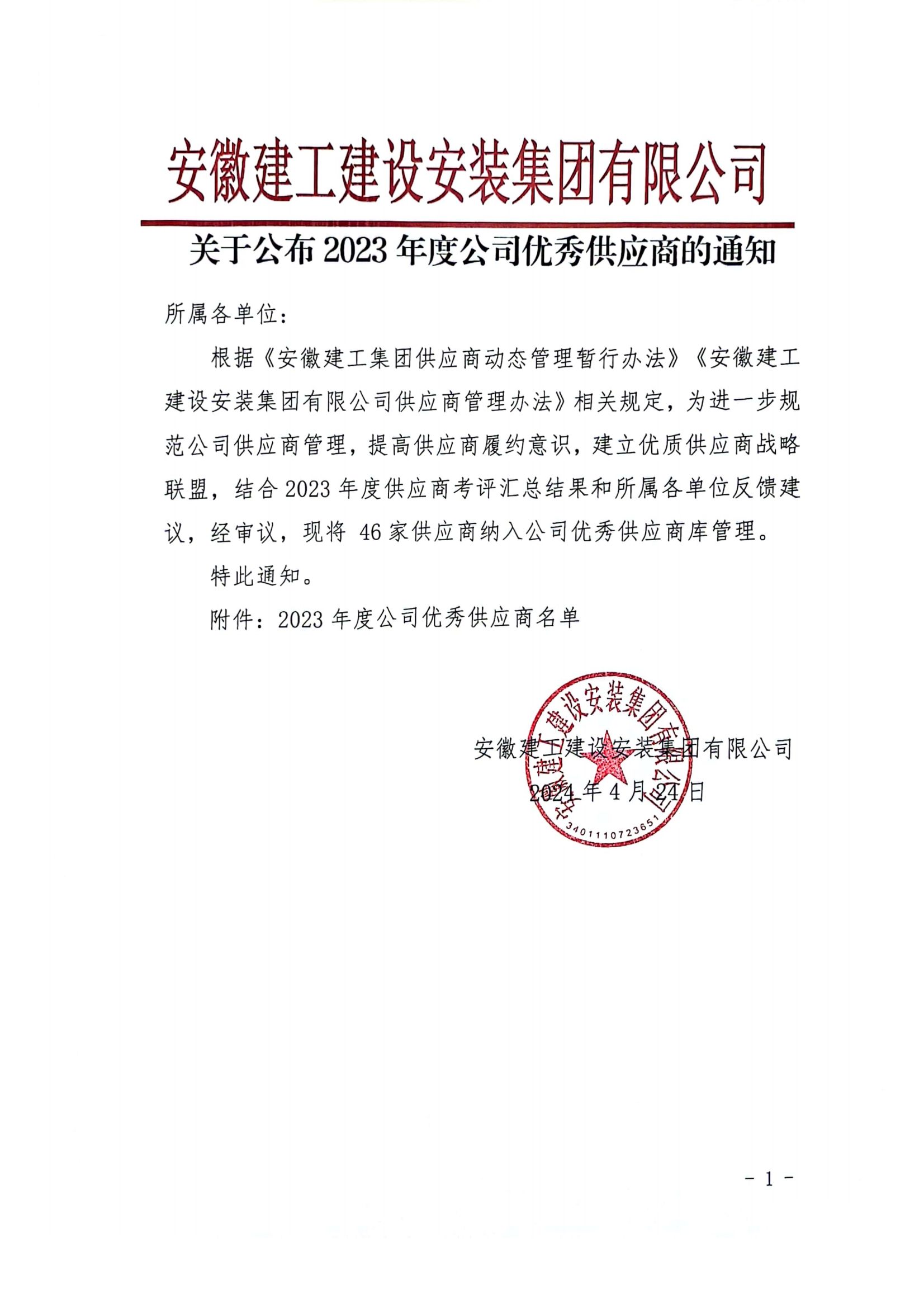 關于公布2023年度公司優秀供應商的通知