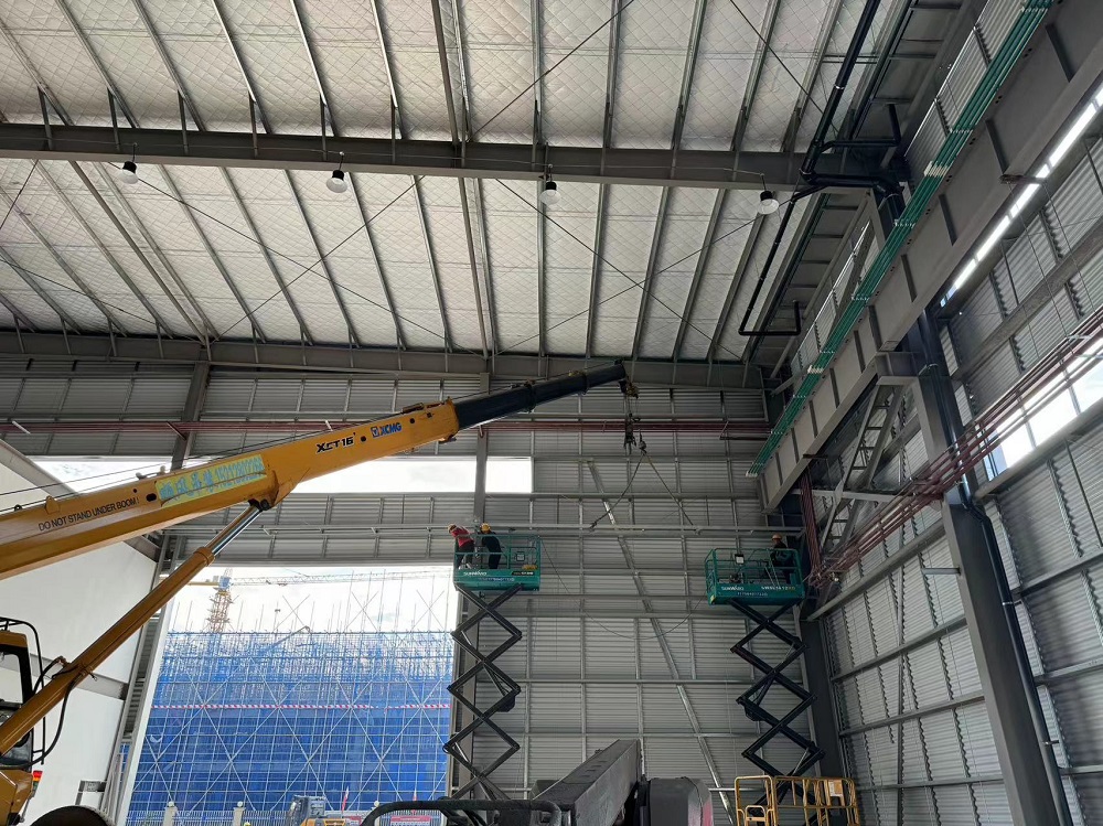 目前項目施工現場100多名工人各司其職,進行2#重鋼車間廠房橋架、消防系統、氣體管道、裝修、圍護結構、門窗、通風氣樓、設備基礎等安裝。同時為應對持續高溫天氣,項目部合理安排作業時間,做好后勤保障工作,現場不間斷巡查時刻關注工人狀態,在確保施工人員健康和安全的前提下,全力以赴加快廠房項目建設進度,預計7月26日前完成大部分項目內容的施工任務。