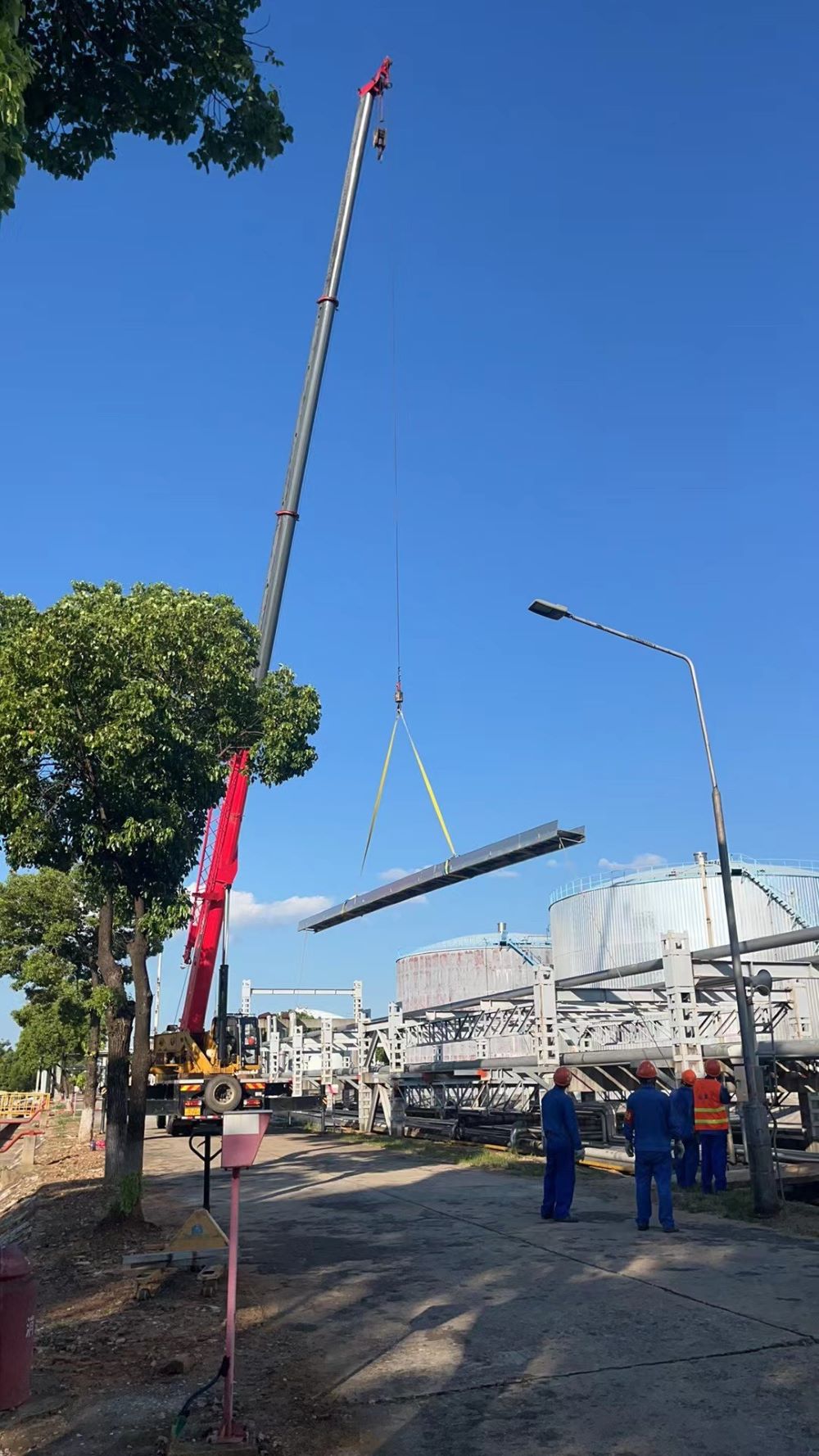 8月1日,該項目進行電纜槽盒托架吊裝工作,該電纜槽盒托架采用18米每段進行吊裝,先集中預制后到現場管廊處進行對接后在吊裝至管廊上。該托架重量約0.6噸,使用1臺25噸吊車,將整段托架吊至上方,并對接安裝連接成一個整體。在項目部全體人員的共同努力下托架順利吊裝到位,該托架吊裝完成標志著此項目安裝工作進入尾聲,為項目按時完工奠定了良好的基礎,目前正在進行電纜橋架吊裝和電纜鋪設工作。